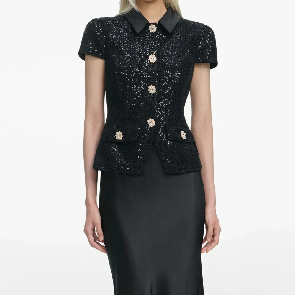 Black sequin bouclé meets the shine of smooth satin to irresistible effect in this maxi dress. A peplum waist and diamanté buttons add to its elegant charm – wear with heels for black tie affairs.